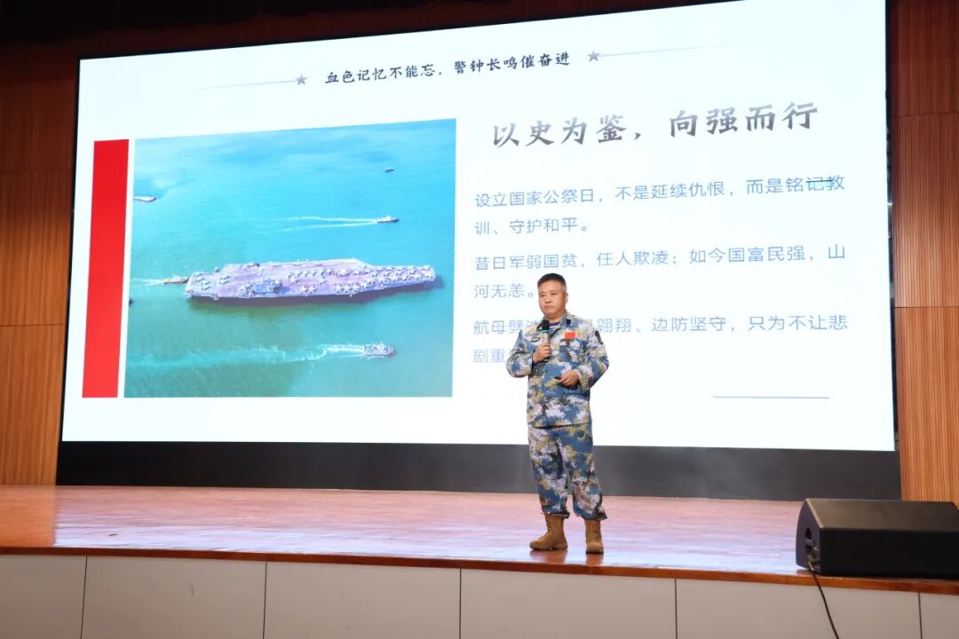 活動邀請中山港口鎮(zhèn)人民武裝部副部長賀洪彪以《銘記歷史守海疆 青春立志報(bào)家國》為題開展專題講座,帶領(lǐng)師生重溫南京大屠殺那段山河破碎的屈辱歷史,闡釋國家公祭日的設(shè)立意義,讓師生深刻理解“銘記歷史、勿忘國恥”的意義?,F(xiàn)場莊嚴(yán)肅穆,全體師生為南京大屠殺死難同胞默哀,用無聲的敬意寄托對逝者的哀思。