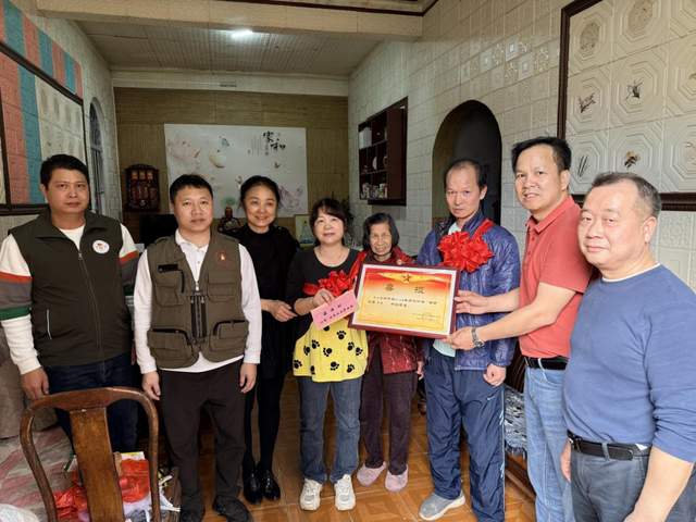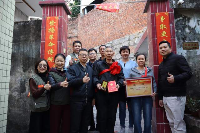 ▲慰問(wèn)組為濠涌村方漢明家屬送上“四有”優(yōu)秀士兵喜報(bào)