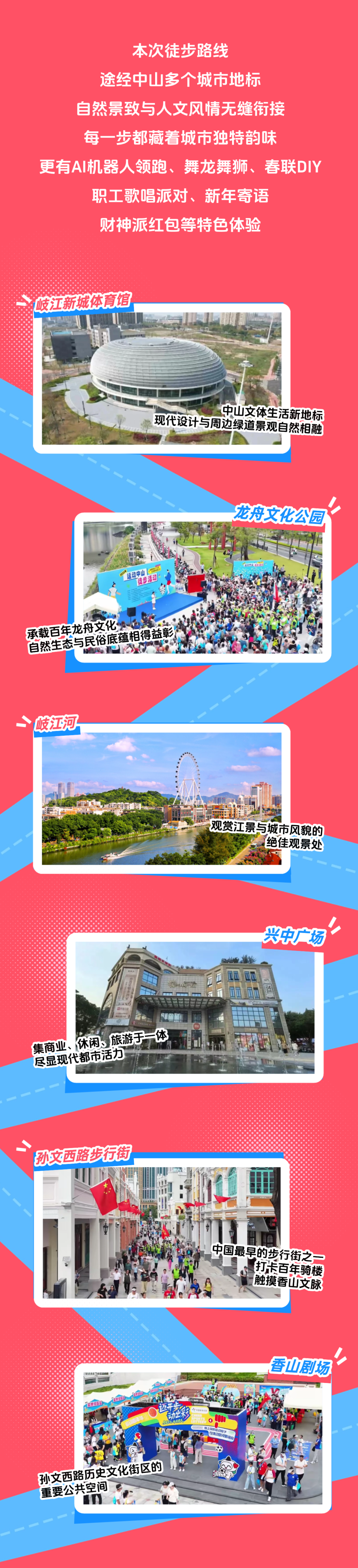 路線:岐江新城體育館 — 岐江沿岸綠道 — 龍舟文化公園 — 員峰橋 — 興中廣場 — 孫文西路步行街 — 香山劇場